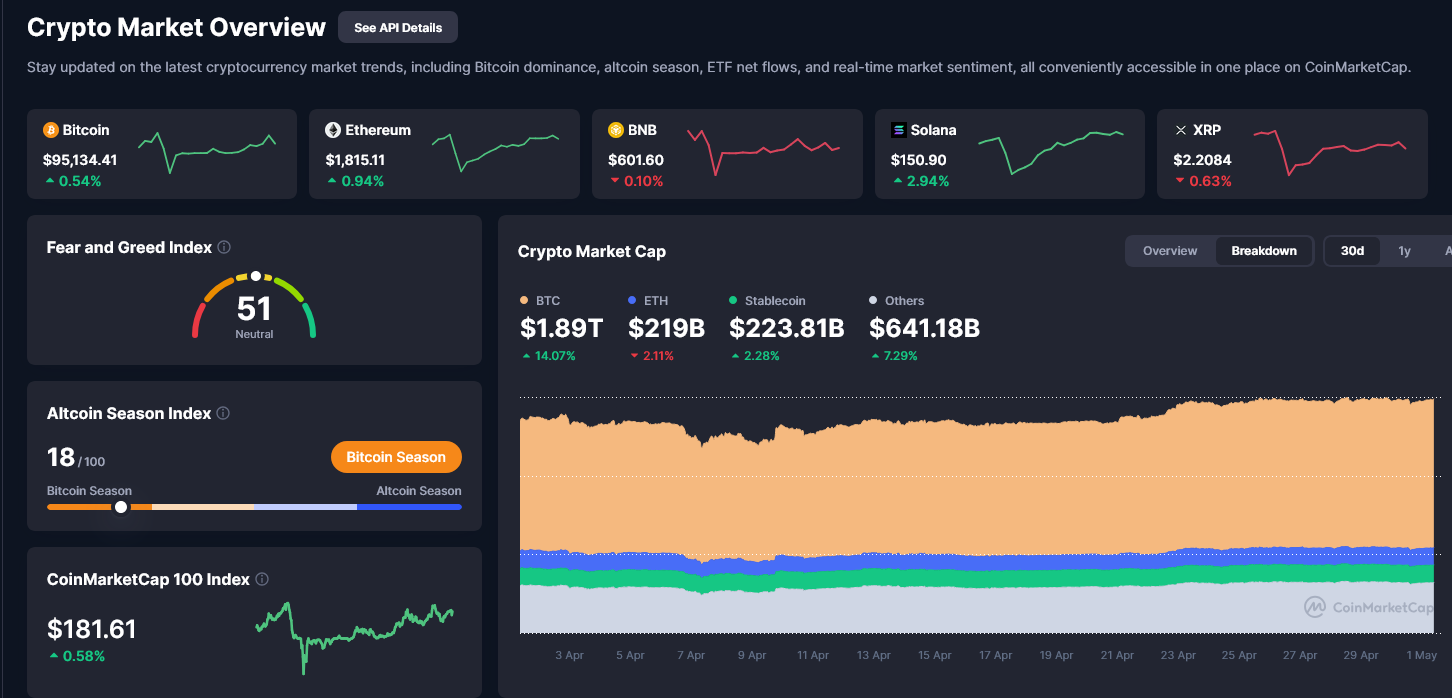 واستقرّ سعر بيتكوين BTC يوم الخميس قرب 95,000 دولار، بينما ظلّت أسعار العملات الرقمية الكبرى الأخرى مثل إيثيريوم ETH، وعملة بينانس BNB ، وسولانا SOL، دون تغير يُذكر.