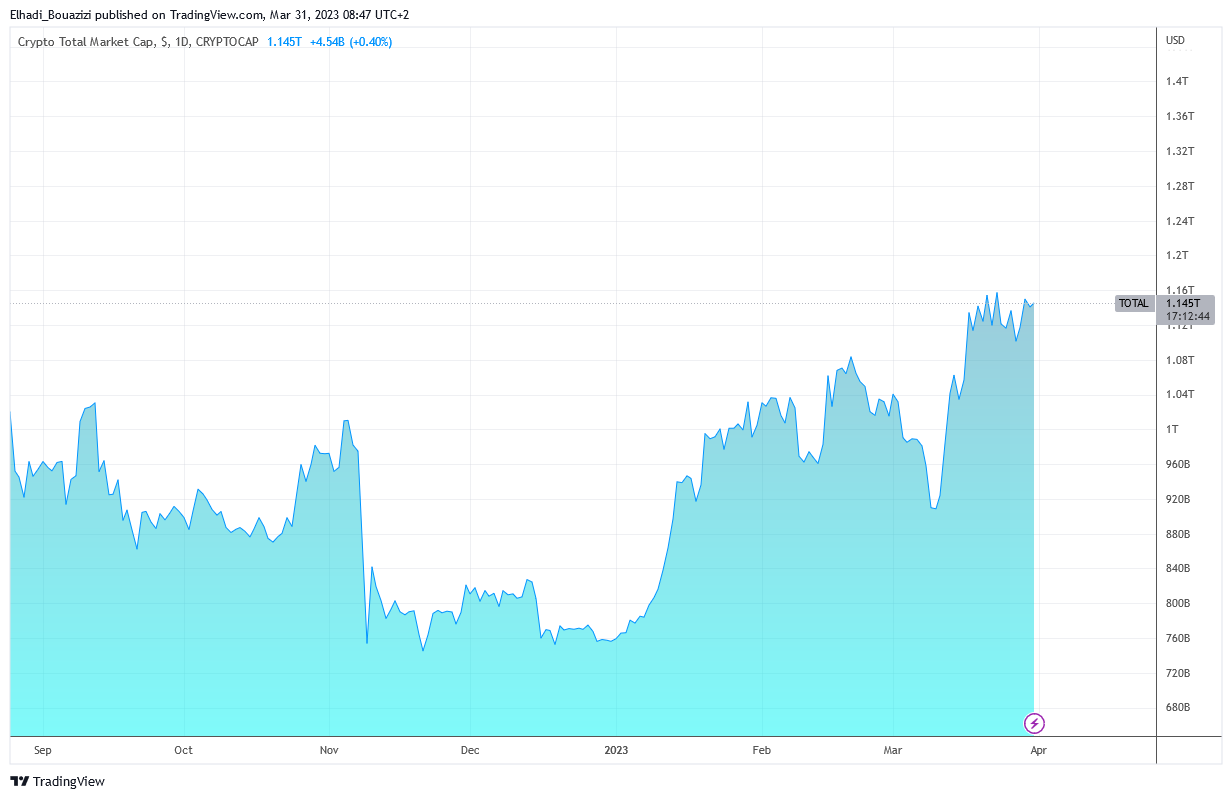 وأظهرت بيانات نفس الموقع، بتاريخ 29 مارس 2023. أن عدد العملات الرقمية المشفرة المتتبعة بلغت 23.095. ما يعني  إضافة 938 عملة رقمية جديدة إلى السوق العملات الرقمية العالمي منذ بداية العام الجاري. مع ارتفاع القيمة السوقية بنسبة كبيرة إلى 1.19 تريليون دولار، مشيرةً إلى استعادة السوق زخمها.