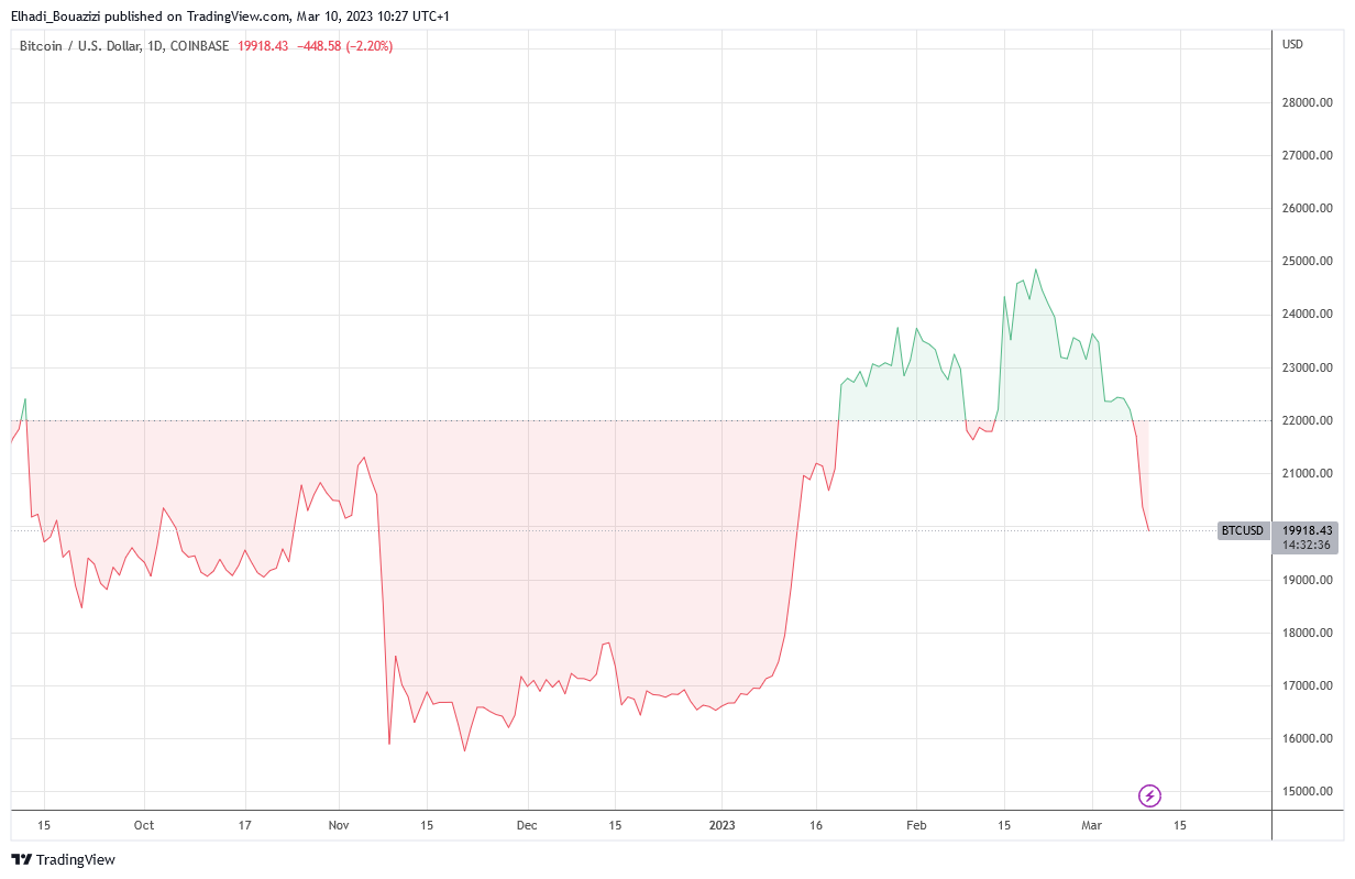 وبعد بداية مشجعة لهذا العام، عاد سعر بيتكوين، أكبر عملة مشفرة في العالم من حيث القيمة السوقية إلى مستويات 20000 دولار أمريكي لأول مرة منذ يناير 2023. بانخفاض حوالي 20 ٪ من أعلى مستوياتها البالغة 25000 دولار أمريكي في فبراير.