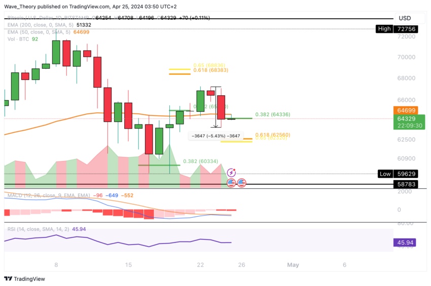ومع ذلك، واجه السعر مقاومة وبدأ مرحلة تصحيحية في اليومين الماضيين، حيث يحوم حاليا حول دعم فيبوناتشي 0.382 عند حوالي 64336 دولارا. إذا تم اختراق مستوى الدعم هذا، فمن المتوقع أن يكون دعم فيبوناتشي الكبير التالي حول 62250 دولارا.