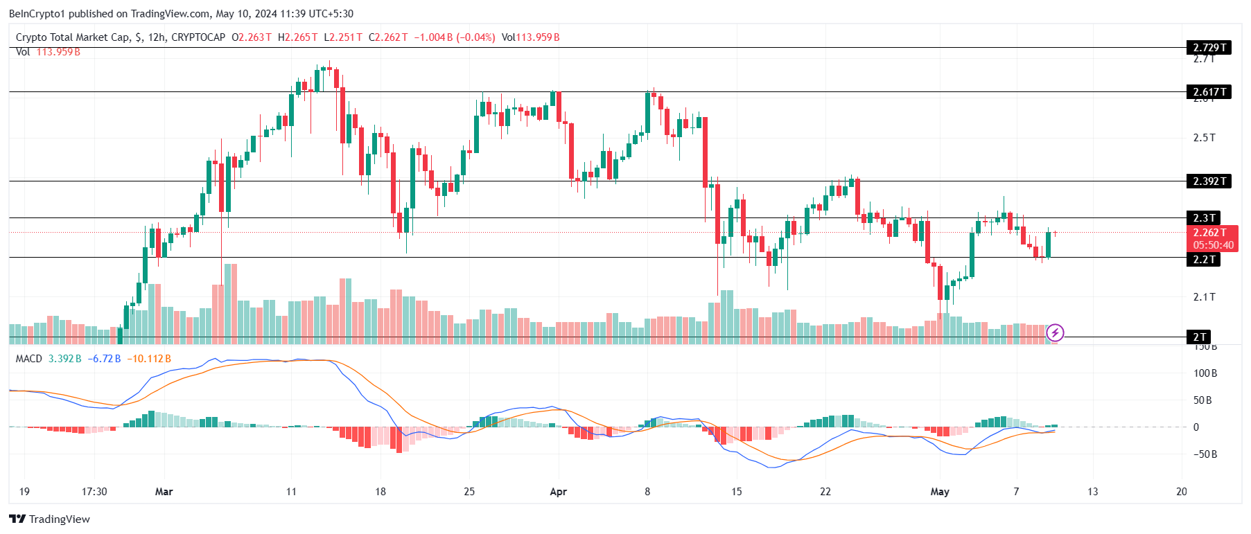 في الوقت الحالي ، تبلغ القيمة السوقية الإجمالية 2.26 تريليون دولار ، مما يدل على إمكانية قلب 2.3 تريليون دولار و 2.4 تريليون دولار في المقاومة إلى دعم خلال الشهر.
