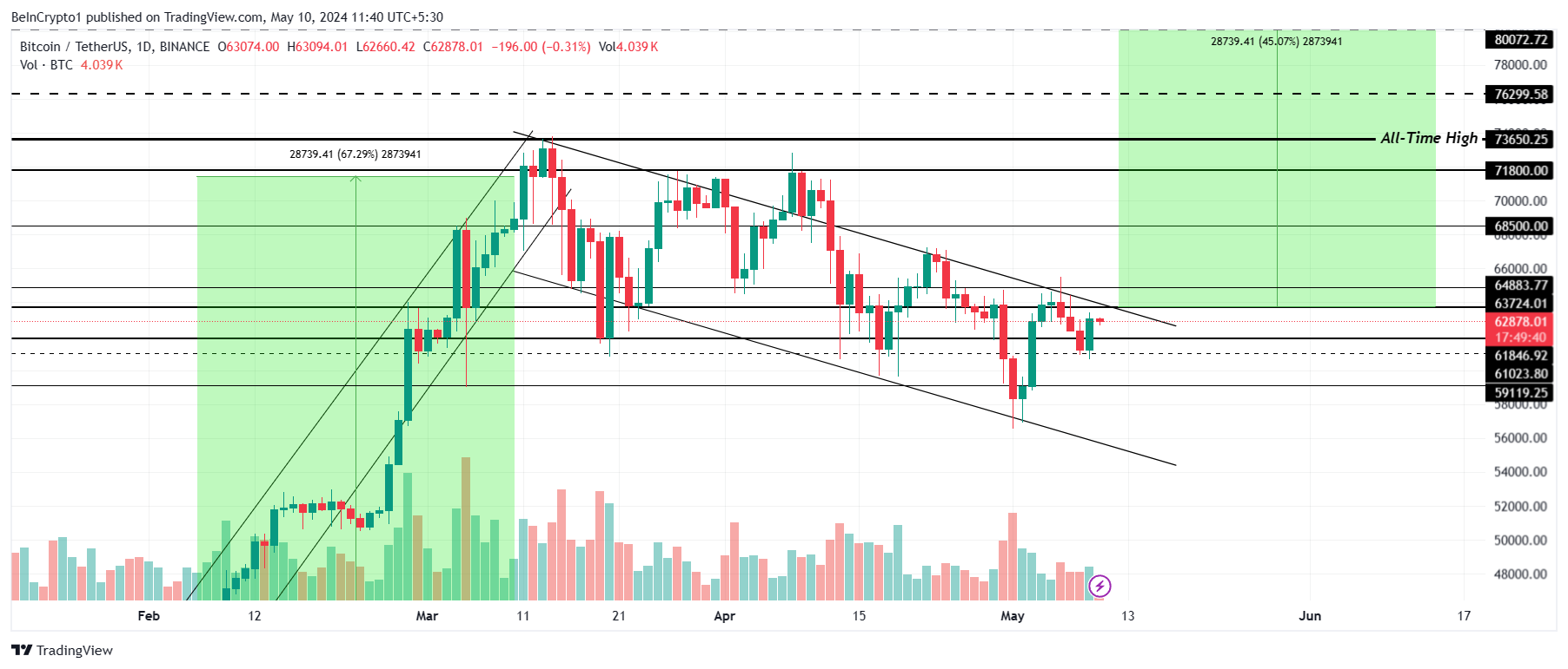 ومع ذلك ، إذا فشل الخرق ، فستظل Bitcoin عالقة في العلم ، ومن المحتمل أن تنخفض إلى 61000 دولار أو أقل.