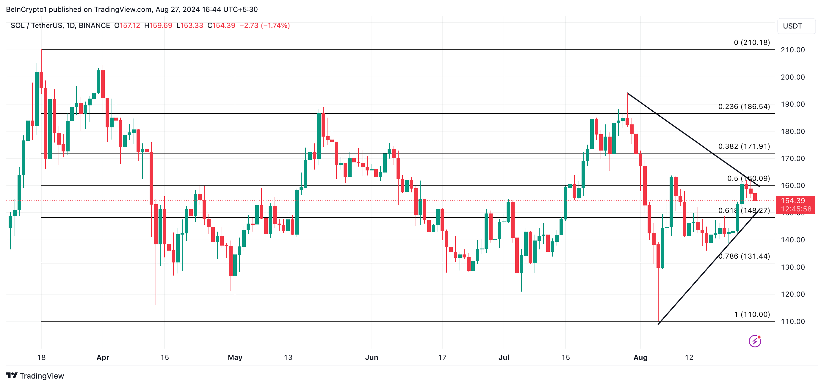 بدأت SOL التداول ضمن نمط المثلث المتماثل في 29 يوليو. يتشكل هذا النمط عندما يتحرك سعر الأصل بين خطين متقاربين، مما يشير إلى فترة توطيد السوق حيث يتنافس المشترون والبائعون على السيطرة.