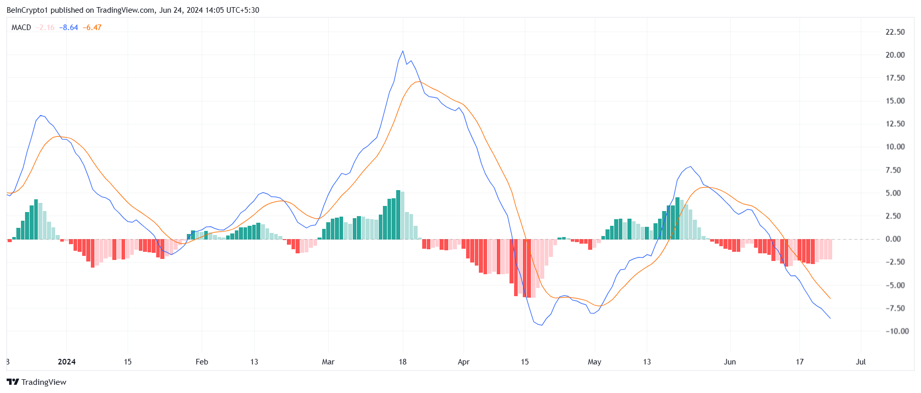 قد يجد سعر سولانا صعوبة في تسجيل تعافٍ بسبب إشارات السوق الأوسع. هذا واضح في مؤشر التقارب والتباعد للمتوسطات المتحركة (MACD). MACD هو مؤشر زخم يتبع الاتجاه يظهر العلاقة بين متوسطين متحركين لسعر الأمان.