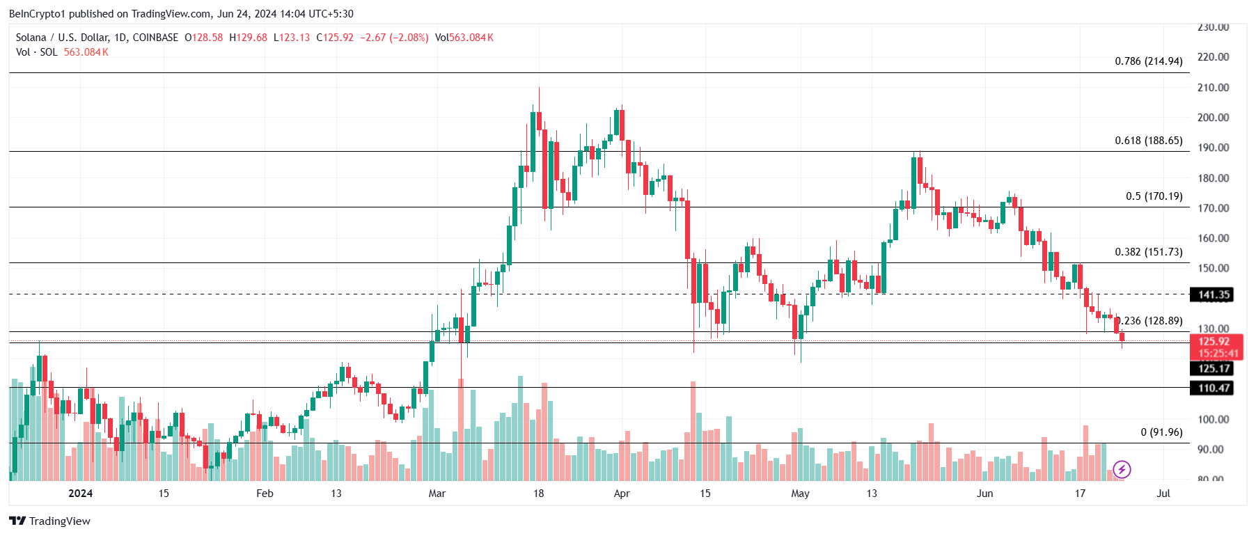 لم يسجل سعر سولانا خلال الشهر ونصف الأخير سوى اتجاه هبوطي، انخفض من 187$ إلى 125$. أدى هذا التراجع إلى خسارة SOL لدعم تصحيح فيبوناتشي بنسبة 23,6% عند 128$.