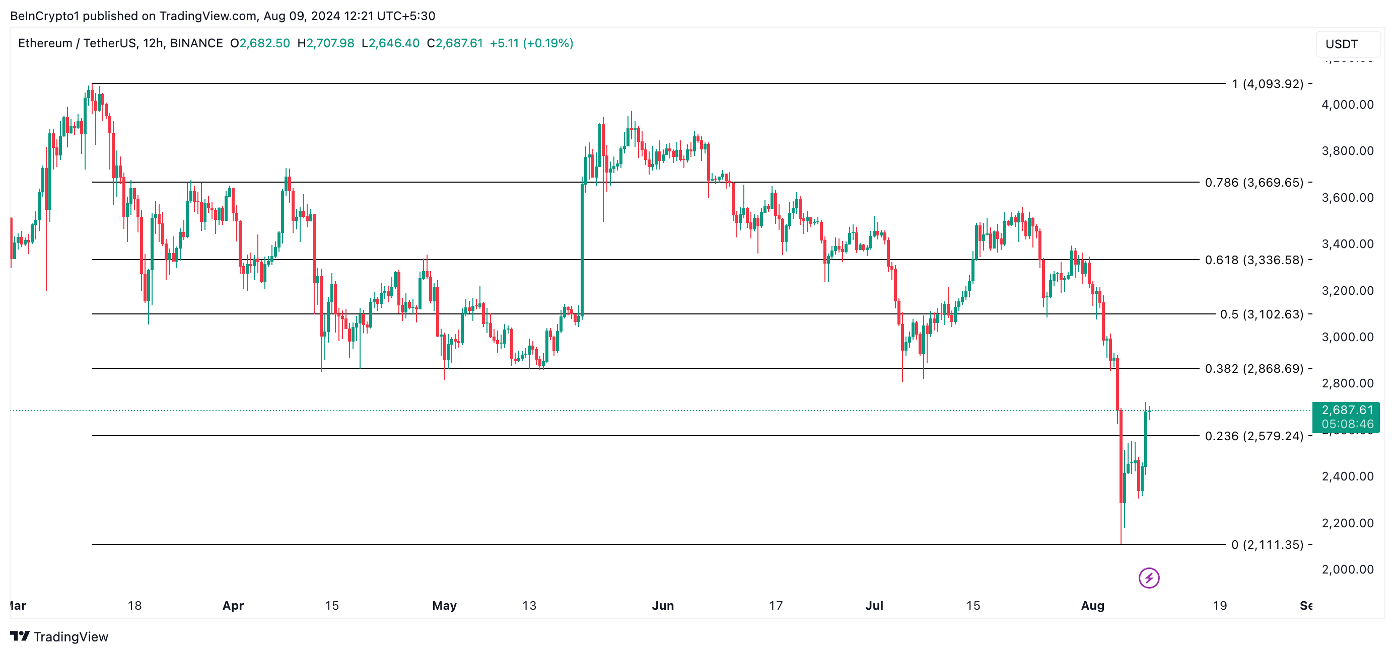يوم الاثنين، شهد السوق العام انخفاضًا كبيرًا، مما أدى إلى انخفاض قيم العديد من الأصول إلى أدنى مستوياتها في عدة سنوات. في ذلك اليوم، انخفض سعر الإيثيريوم إلى أدنى مستوى له في سبعة أشهر وهو 2,100 دولار قبل أن يتعافى.