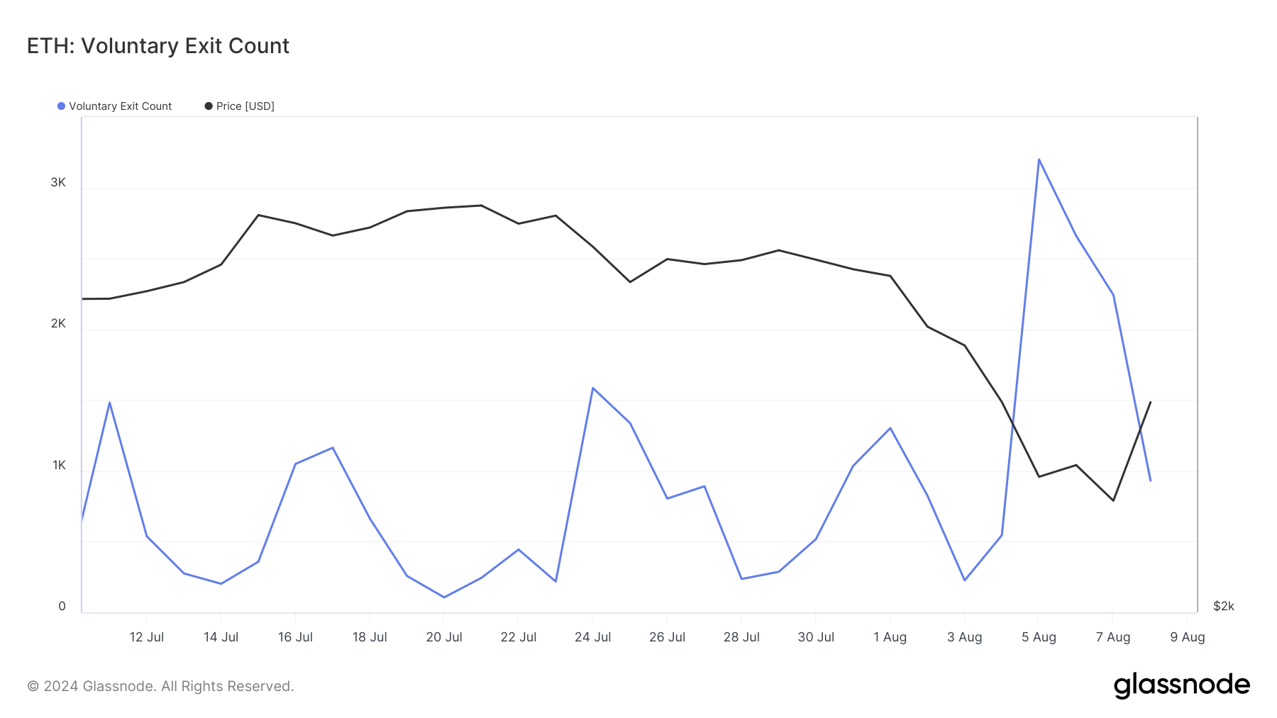 بسبب الانخفاض في السوق وقيمة الإيثيريوم، بلغ عدد المُدققين الذين غادروا طوعًا شبكة الإيثيريوم إثبات الحصة (PoS) 3,199 في ذلك اليوم، وهو أعلى عدد من الخروج المسجل في الشهر الأخير.