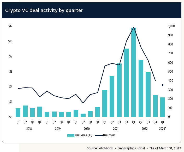 في ظل حالة عدم اليقين من الإطار التشريعي و التنظيمي الذي يمكن تعمل في داخل صناعة العملات الرقمية المشفرة، استمر معدل تمويل شركات العملات الرقمية المشفرة في الانخفاض خلال الأشهر الثلاثة الأولى من عام 2023. مسجلًا بذلك الفصل الرابع على التوالي من تراجع النشاط الاستثماري في هذا القطاع.