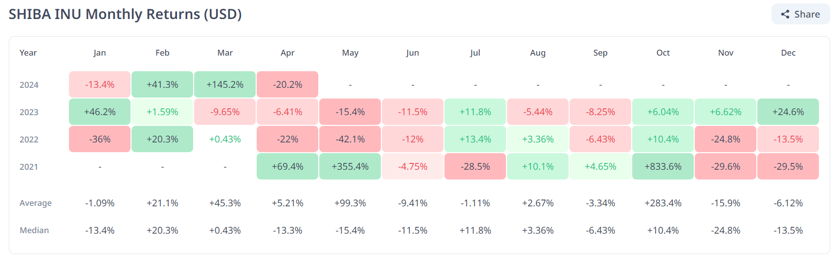 والجدير بالذكر أن المحللين يتوقعون أن يمتد هذا الاتجاه التصاعدي إلى شهر مايو ، والذي عادة ما يكون مربحا لعملة SHIB ، حيث يبلغ متوسط ربحيته 99.3٪. إذا تكرر التاريخ ، فقد يرتفع سعر SHIB إلى 0.000050 دولار في الشهر المقبل. و كتب أحد المتداولين: