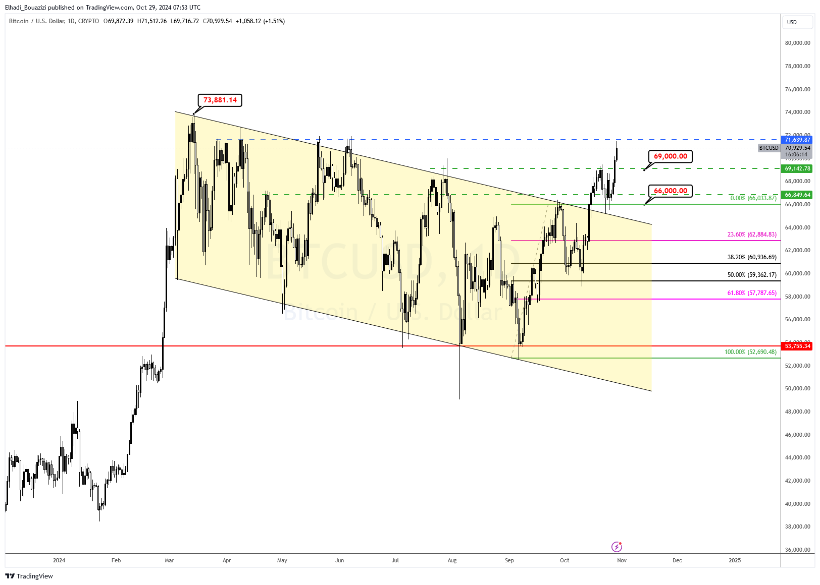 دارياس سيت (Darius Sit)، المؤسس المشارك لشركة QCP Capital (كيو سي بي كابيتال)، أوضح أن بعض المتداولين الذين قاموا بفتح صفقات بيع عند مستوى 70 ألف دولار تعرضوا لتصفية مراكزهم. حيث يبدو أن السوق يُسعر بشكل متزايد في احتمال فوز ترامب في الانتخابات.