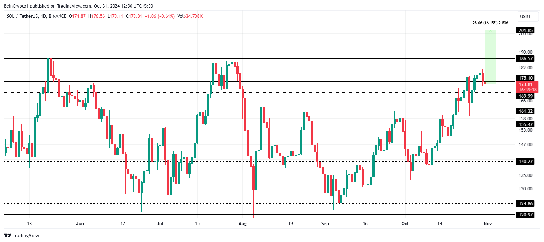 حالياً، يتم تداول عملة SOL عند مستوى 173 دولاراً، على بُعد 16% فقط من حاجز 200 دولار. وللوصول إلى هذا الهدف، يجب أن تتجاوز حاجز المقاومة عند 186 دولاراً، وهو مستوى لم تتمكن من تجاوزه منذ منتصف مايو. وتوحي استمرارية هذا الحاجز لمدة خمسة أشهر بأن سولانا قد تواجه صعوبة في مواصلة الزخم الصعودي.