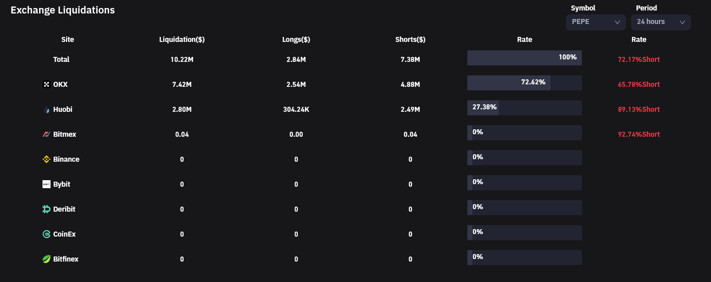 حيث بلغت 10 ملايين دولار على جميع عقود Pepe المستقبلية خلال الـ24 ساعة الماضية،  حسب بيانات من Coinglass.