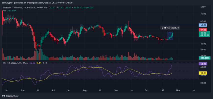 وارتفعت قيمة لايتكوين بأكثر من 12% في الأيام الخمسة الماضية، حيث سيطرة المنحنى التصاعدي على الحركة السعرية كما ساعدت مكاسب التشفير على زيادة هذا الاتجاه في وقت اختبار القيمة السوقية العالمية للعملات الرقمية التي وصلت إلى تريليون دولار.