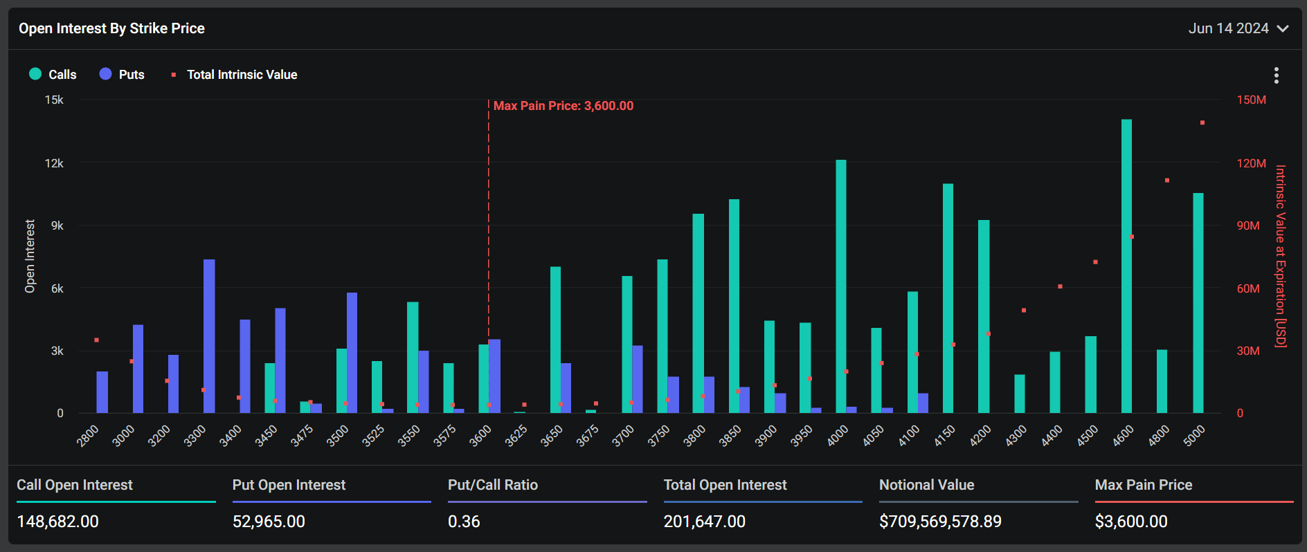بالإضافة إلى ذلك، ستنتهي صلاحية 201,647 عقدا من عقود إيثريوم في نفس الوقت. وفقا لبيانات Deribit، تبلغ القيمة الاسمية لهذه العقود 709.76 مليون دولار، بحد أقصى لنقطة الألم 3،600 دولار. تظهر البيانات أيضا أن نسبة البيع إلى الشراء لهذه الخيارات هي 0.36.