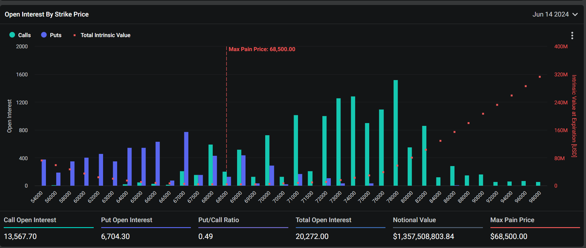 خيارات بيتكوين منتهية الصلاحية هذه لها نقطة ألم قصوى تبلغ 68.5 ألف دولار. يمثل هذا مستوى السعر حيث سيواجه حاملو الخيارات أكبر الخسائر المالية، مما يمثل عتبات حرجة للمشاركين في السوق.