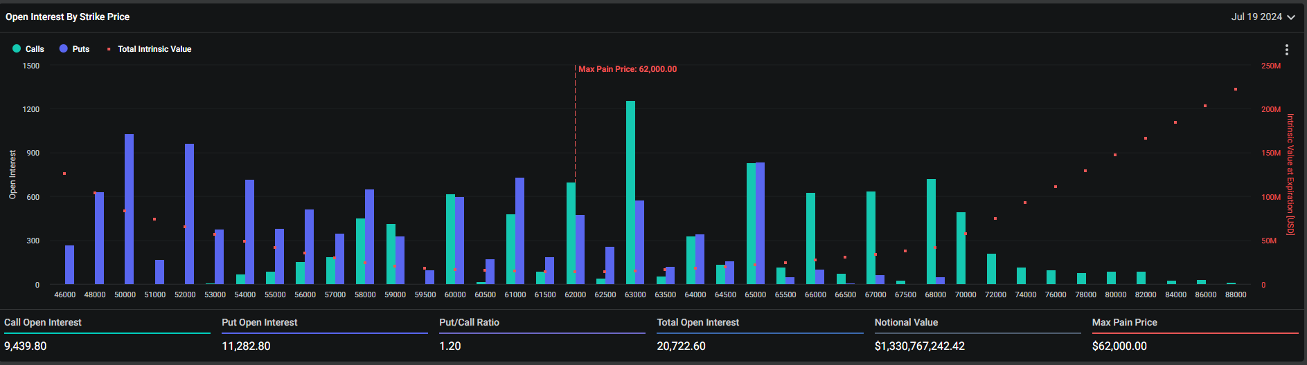 وفقًا لبيانات Deribit، من المقرر أن تنتهي صلاحية 20,679 عقد بيتكوين، بقيمة تقريبية 1,31 مليار دولار، اليوم. هذه الدفعة أقل قليلاً من أرقام الأسبوع الماضي، التي كانت 23,832 عقد. تحتوي هذه العقود المنتهية على نسبة وضع إلى استدعاء تبلغ 1,19، مع نقطة ألم قصوى تبلغ 62 ألف دولار.