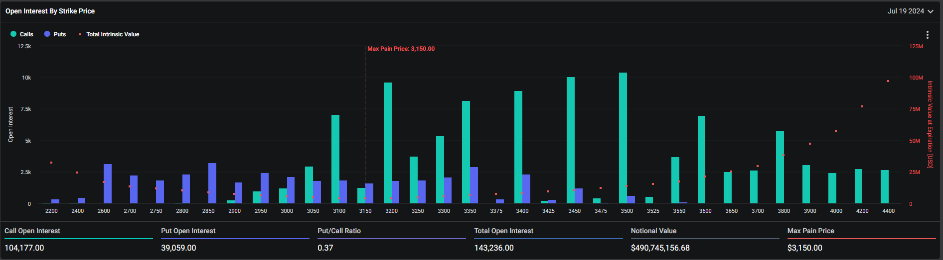 بالإضافة إلى خيارات بيتكوين، ستنتهي صلاحية 142,583 عقد إيثيريوم اليوم، بقيمة اسمية تزيد عن 483,84 مليون دولار. نسبة الوضع إلى الاستدعاء هي 0,37، مع نقطة ألم قصوى تبلغ 3,150 دولار.