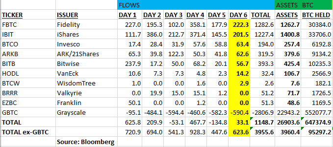 على الرغم من أن صندوق FBTC التابع لشركة فيدليتي شهد تدفقات أعلى قليلاً. إلا أن صندوق IBIT التابع لشركة بلاك روك يتصدر من حيث الأصول تحت الإدارة. حيث يحتفظ بـ 1.4 مليار دولار مقارنة بما يقرب من 1.3 مليار دولار لصندوق فيدليتي.
