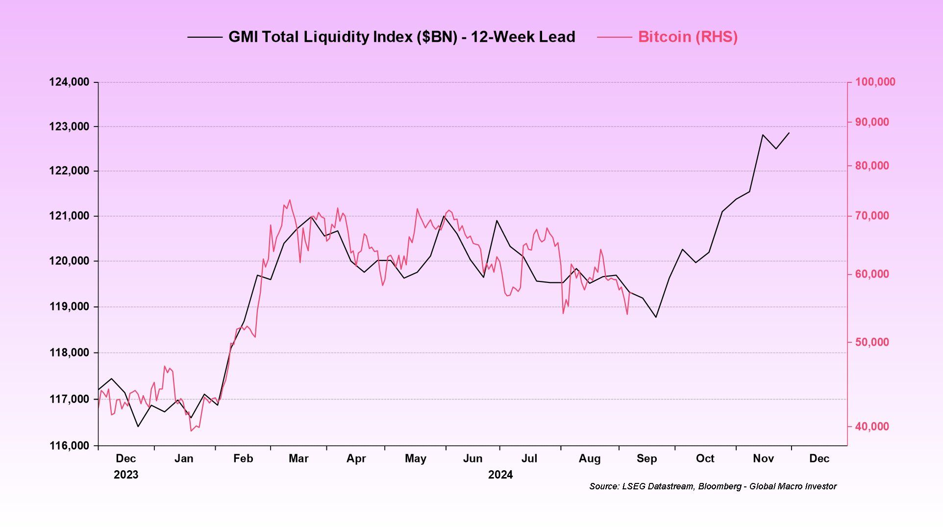 مؤشر الأموال العالمي (GMI)، الذي يقيس حجم الأموال المتداولة بين المستهلكين والبنوك، في ارتفاع. يشير الارتفاع في مؤشر GMI عادةً إلى توافر أموال أكثر، والذي قد يؤدي إلى زيادة شراء بيتكوين.