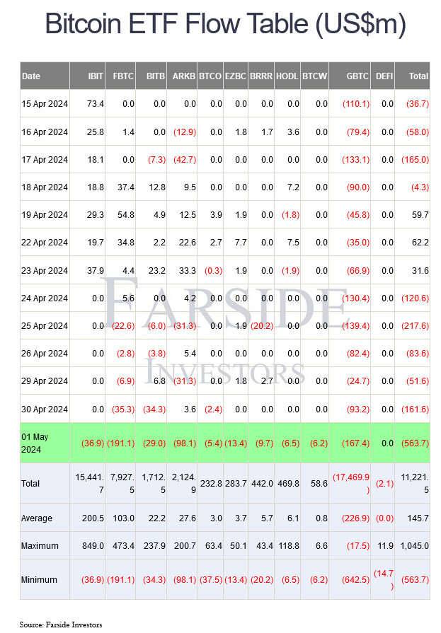 وحسب بيانات  شركةFarside Investors ، شهدت صناديق  ETF بيتكوين الفوري الأحد عشر صافي تدفقات سلبية تراكميًا بلغ 563.7 مليون دولار، وهو الأكبر منذ بدء تداول الصناديق في 11 يناير، لتسجل بذلك سلسلة خسائر استمرت خمسة أيام. حيث سحب المستثمرون ما يقرب من 1.2 مليار دولار من صناديق الاستثمار المتداولة منذ 24 أبريل.