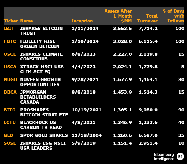 أشار المحلل في وكالة بلومبرغ ، إريك بالتشوناس Eric Balchunas، أن صناديق ETF بيتكوين الفوري IBIT وFBTC التابعة لشركتي بلاك روك و وفيدليتي على التوالي. و التي أقرتها لجنة الأوراق المالية والبورصات الأمريكية (SEC) في العاشر من يناير 2024. سجّلت أفضل إطلاق لصندوق ETF خلال العقود الثلاثة الماضية من حيث حجم تدفقات رؤوس الأموال الداخلة إليها في شهرها الأول.
