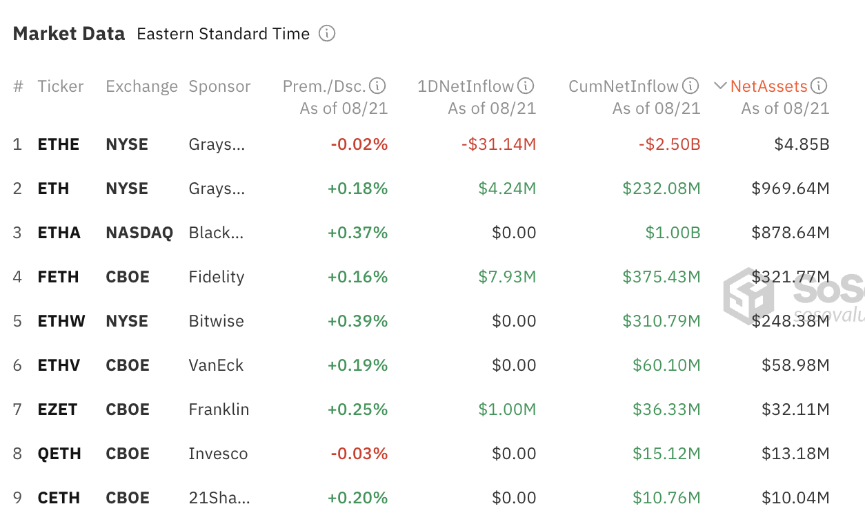 ومع ذلك، تحتل الأصول الصافية لـ ETHA المرتبة الثالثة، خلف صندوق Grayscale mini Ether (ETH) وصندوق Ethereum (ETHE)، الذين يمتلكون أصولًا بإجمالي 4,85 مليار دولار و969,64 مليون دولار على التوالي. يمتلك ETHA أصولًا بإجمالي 878,64 مليون دولار.