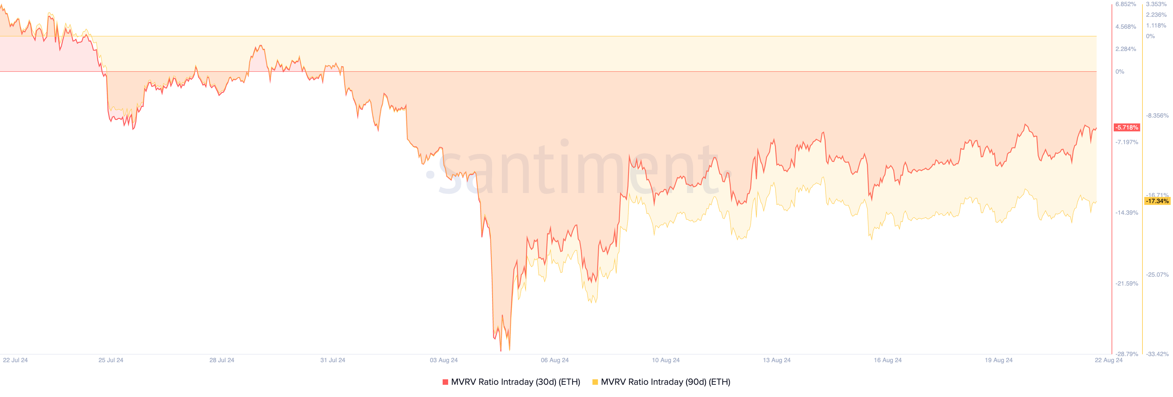 تواجه الإيثيريوم صعوبة في الاستقرار فوق علامة الـ3,000 دولار، مما يشير إلى فرصة شراء محتملة، كما يشير إليها معدل القيمة السوقية إلى القيمة المحققة (MVRV) السلبي. وفقًا لـ Santiment، تبلغ نسب MVRV لمدة 30 يومًا و90 يومًا -5,71% و-17,34% على التوالي، مما يشير إلى أن الأصل قد يكون مقومًا بأقل من قيمته.