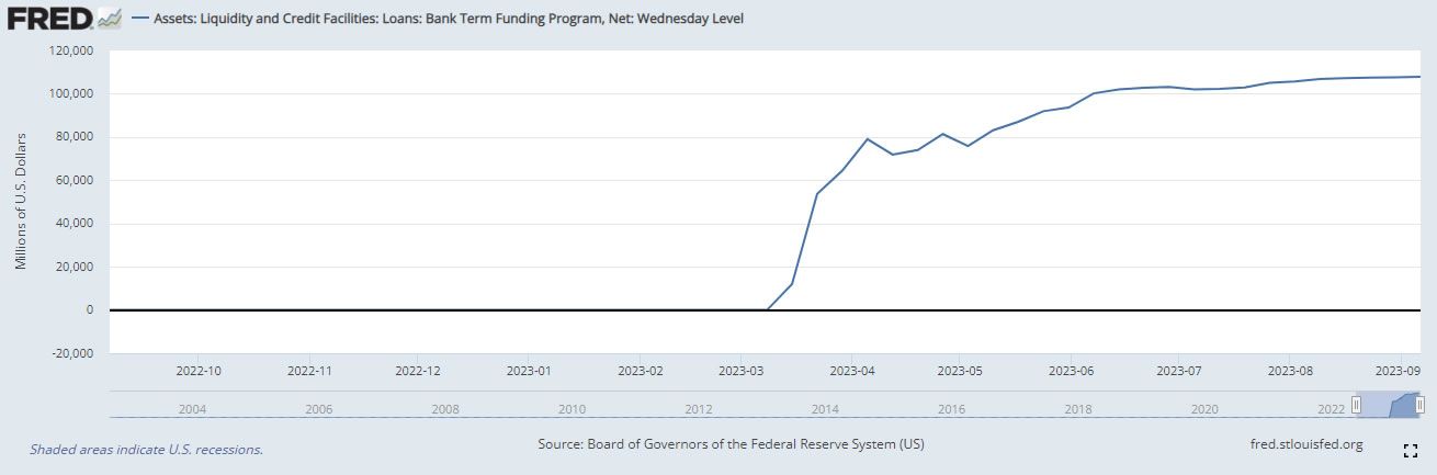 على الجانب الآخر، وصل برنامج التمويل لأجل بنك الاحتياطي الفيدرالي (BTFP) إلى ذروة بلغت 107.8 مليار دولار، وفقًا لبنك الاحتياطي الفيدرالي في سانت لويس.