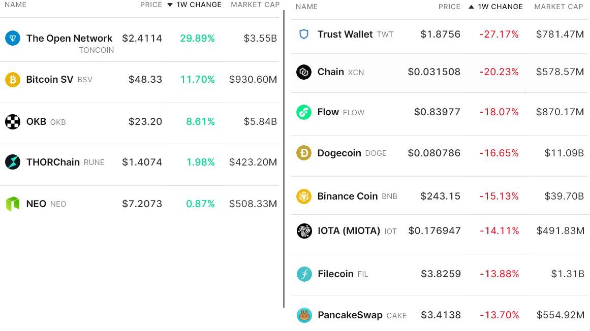وبالحديث عن الارتفاعات في سوق العملات الرقمية، فقد شهدت عملة TON زيادة نسبتها 30% بعد إطلاق مجموعتها على تليجرام، وارتفعت عملة BSV بنسبة 11.7% كما شهدت عملة TWT تصحيح مسار بنسبة 27.2% بعد إتمام شركة بينانس عمليات سحب بقيمة 1.9 مليار دولار خلال يوم واحد.
