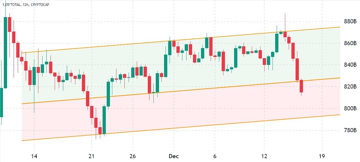 وانخفضت القيمة السوقية للعملات الرقمية بنسبة 8.1% خلال اليومين الماضيين نتيجة عدم النجاح في كسر المقاومة التي وصلت إلى 880 مليار دولار في الرابع عشر من ديسمبر.