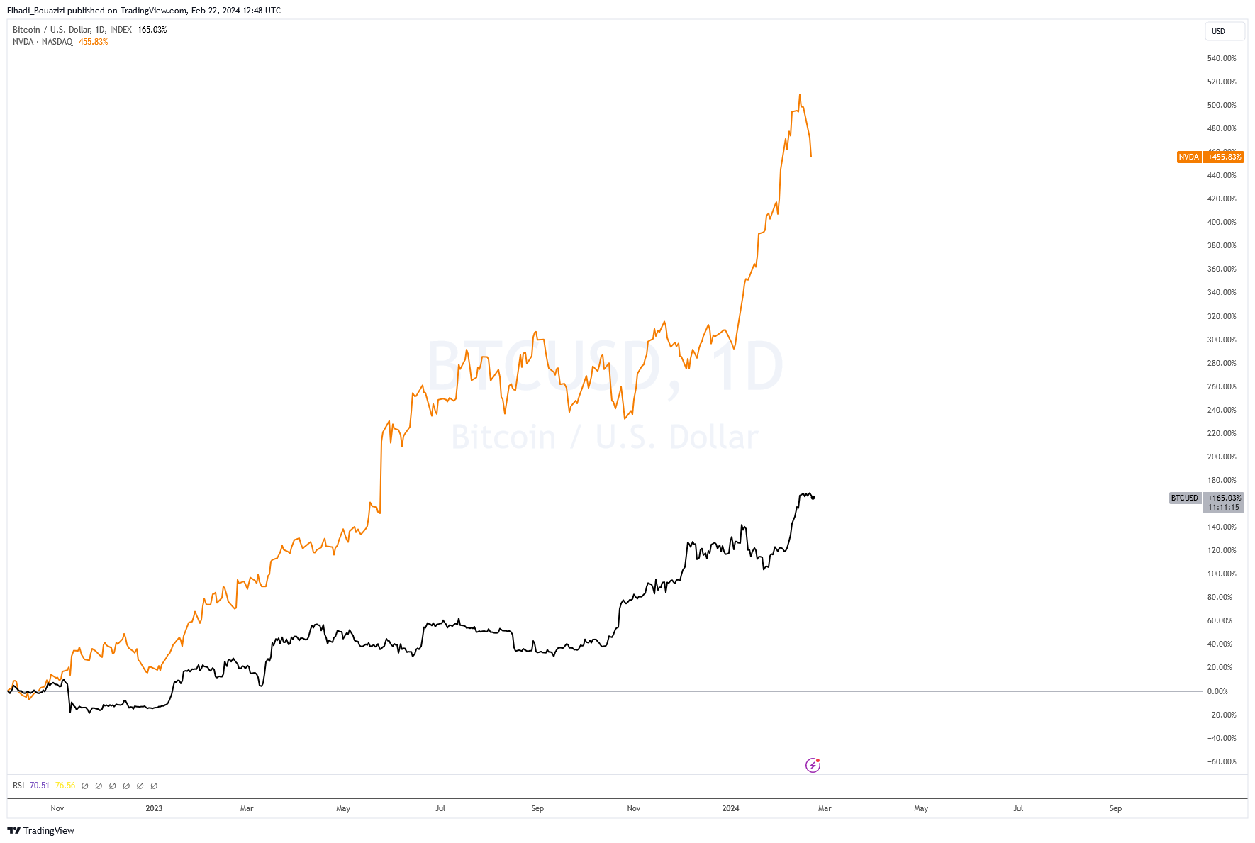 و لإعطاء صورة تقريبية لقوة صعود سعر سهم انفيديا، لنقارن أداءه مع سعر عملة بيتكوين BTC.