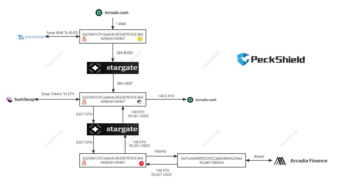 وفي العاشر من يوليو، أفادت شركة PeckShield لأمن البلوك تشين أن أحد أفراد مجتمع التشفير قد اكتشف استغلالًا لمنصة الإقراض Arcadia Finance.