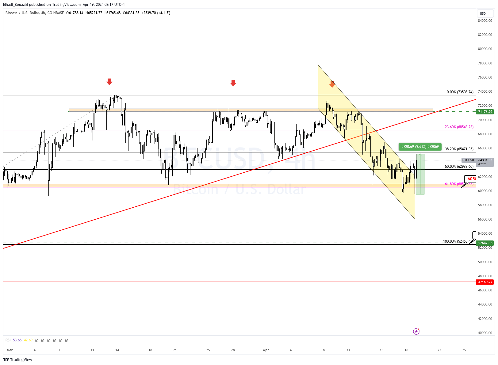 سعر البيتكوين BTC يتداول الآن تحت مستوى فيبوناتشي 38.2% عند سعر 65,400 دولار. بعد أن صعد أكثر من 9.6% في غضون ساعات قليلة.