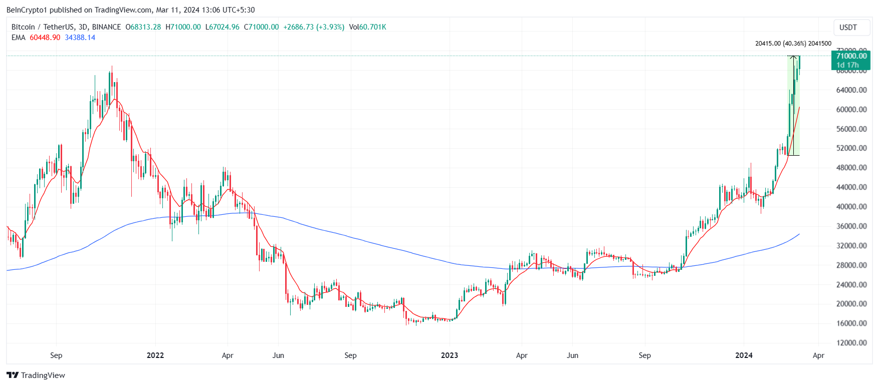 شكل سعر البيتكوين BTC أعلى مستوى جديد على الإطلاق، متجاوزًا منطقة 71,000 دولار. ومع ذلك، لا يزال الارتفاع مستمرًا حتى وقت كتابة هذا التقرير.