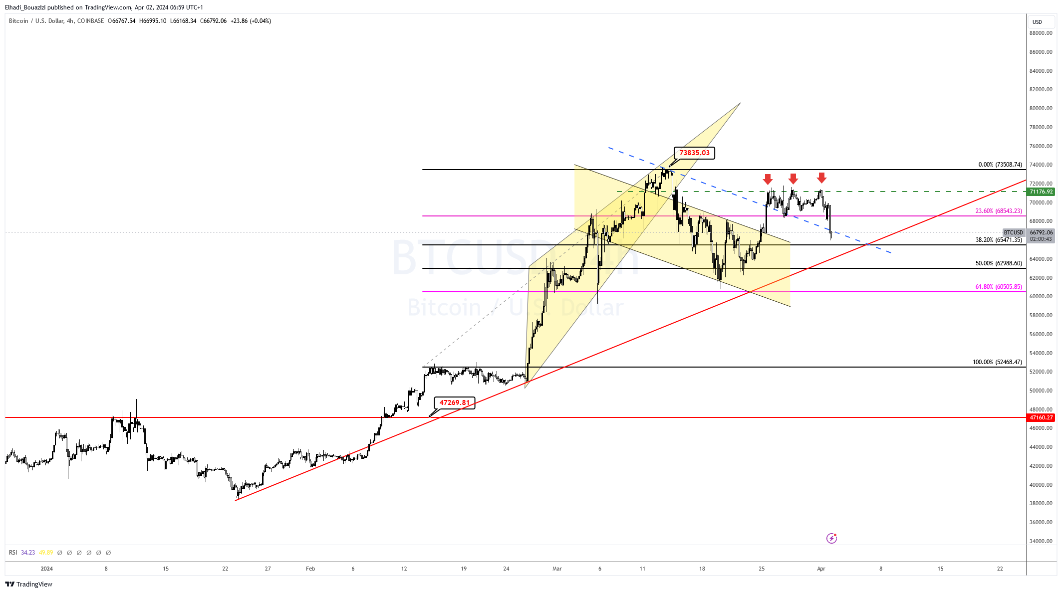 و قلنا أنه في حالة كسر السعر 68,500 دولار سوف نشهد هبوط نحو مستوى الدعم فيبوناتشي 50% عند سعر 65,500 دولار، و هذا ما حدث تقريبا.