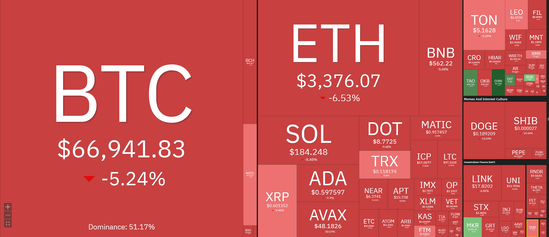 تراجع سعر عمة بيتكوين BTC بقوة بعد افتتاح جلسة التداولات الآسيوية يوم الثلاثاء . حيث انخفض بأكثر من 5% من مستويات 70,000 دولار إلى 66,000 دولار في غضون ساعات قليلة . هذا التراجع في العملة الرائدة أغرق مع كامل السوق في المنطقة الحمراء، أين شهدت بعض العملات الرقمية انخفاضات بنسب ثنائية الأرقام.