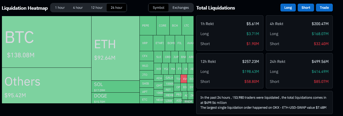 فحسب بيانات منصة coinglass حدثت تصفيات في سوق العقود الآجلة بلغت قيمتها حوالي 500 مليون دولار، خلال مدة 24 ساعة الماضية في وقت الكتابة. 413 مليون من هذه التصفيات كانت عقود شراء طويلة على مختلف العملات الرقمية.