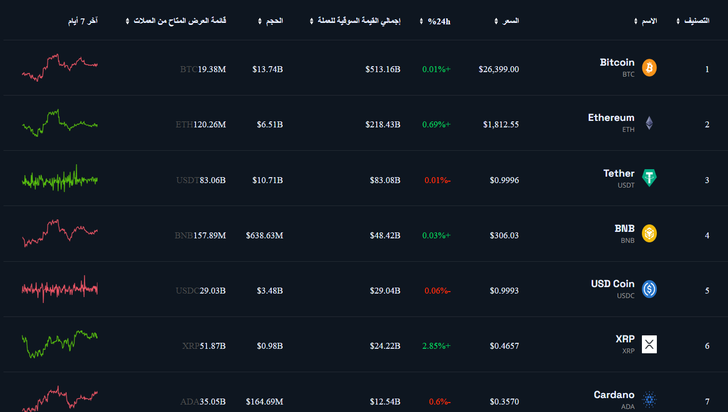 وفيما يلي نوضح لكم نظرة على العملات الرقمية الكبرى، ولمشاهدة القائمة كاملة اضغط هُنا