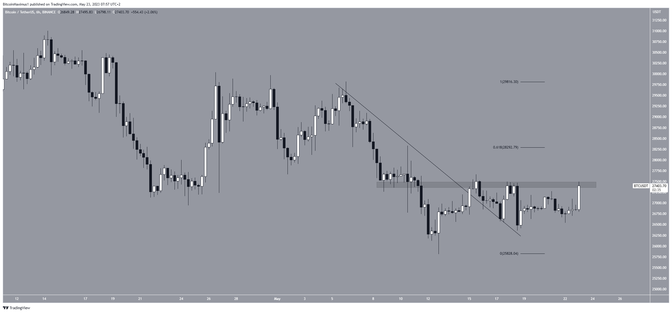 في نفس السياق، اخترق سعر بتكوين خط المقاومة التنازلي في 15 مايو، ولكنه لم يحافظ على ارتفاعه لينخفض إلى ما دون مستوى الاختراق بعد وقت قصير. واستعادت العملة المشفرة مكانتها لتبدأ في اتخاذ حركة تصاعدية في 18 مايو. وفي الفترة الحالية تحاول العملة الخروج منطقة المقاومة البالغة 27400 دولار.