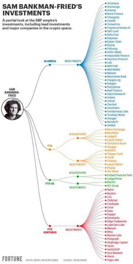 وطبقاً لما ذكرته منصة Crunchbase فإن الاستثمارات المختلفة لبانكمان فرايد كانت من قبل شركة Alameda المسؤولة عن 184 استثمار، وشركة FTX Ventures عن 48 استثمار، وبورصة FTX المسؤولة عن 21 استثمار.