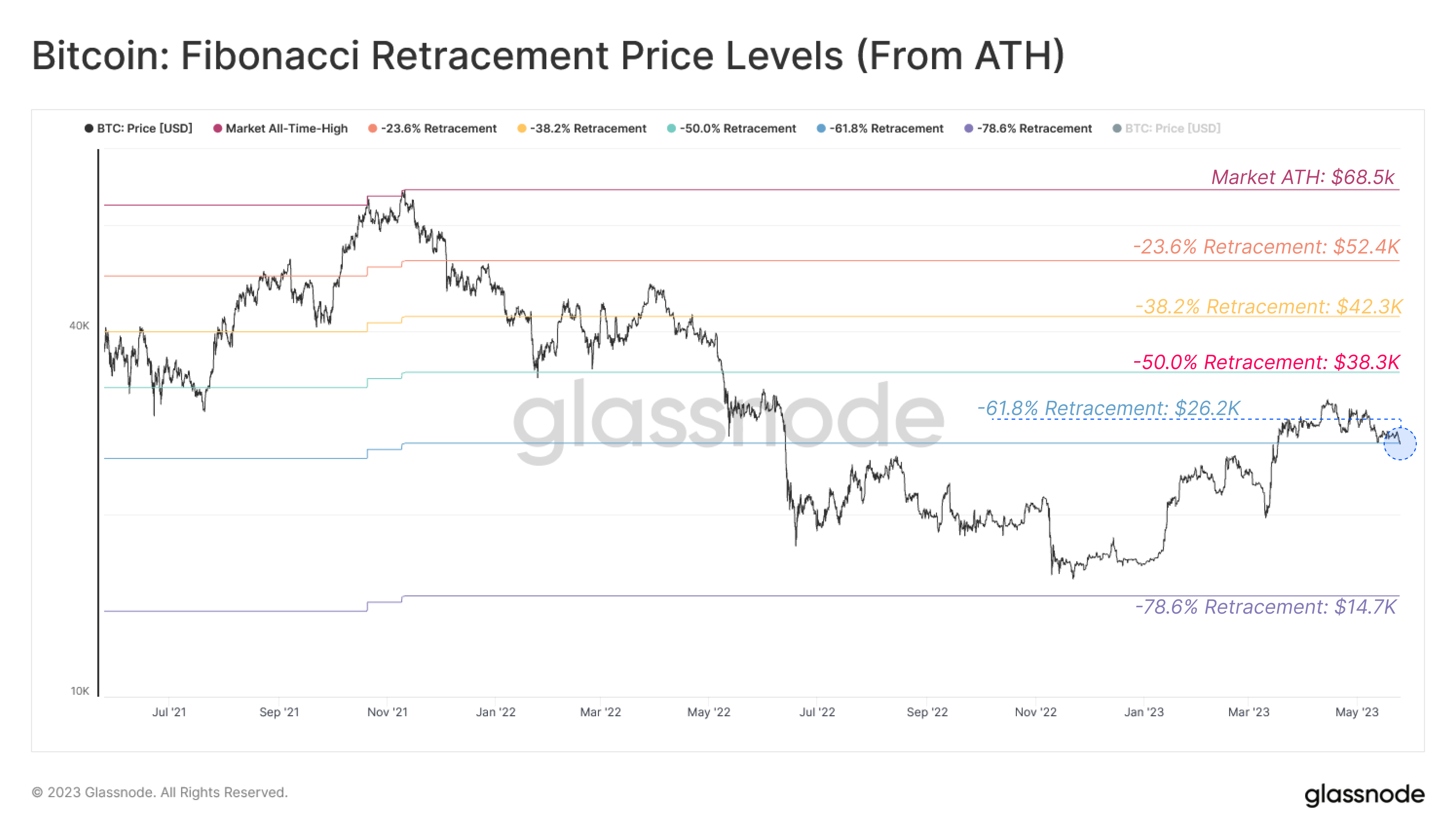 وانخفض الأصل الرقمي إلى مستوى دعم فيبوناتشي رئيسي طويل الأجل عند -61.8% والذي ارتبط بنحو 26200 دولار وفقًا لما ذكرته منصة Glassnode.