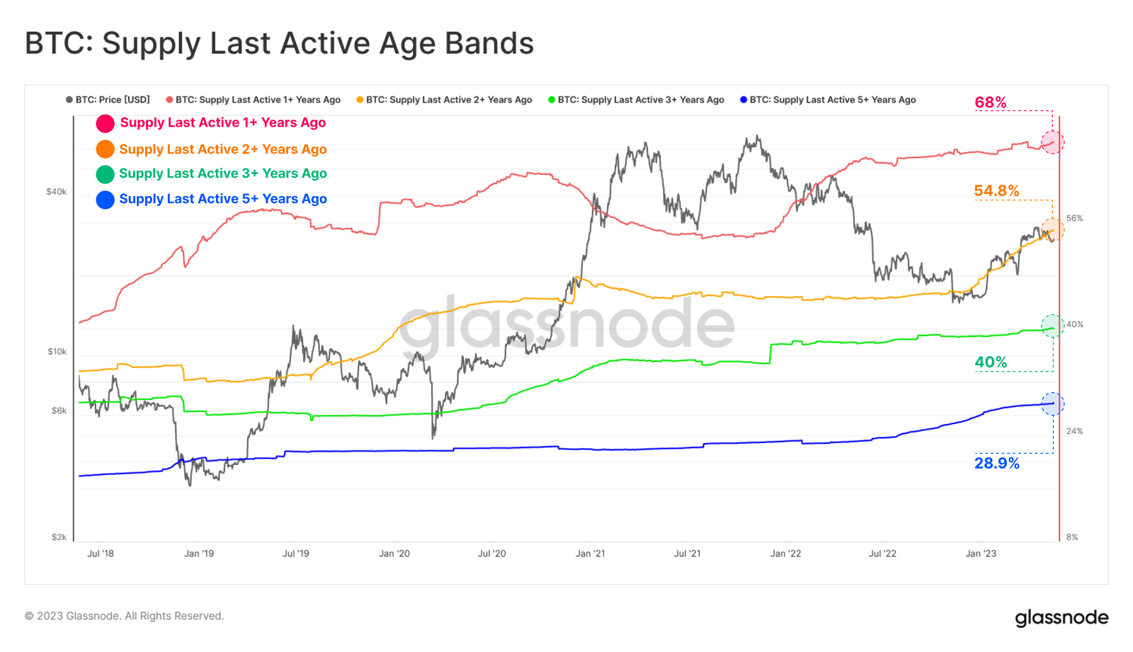استمرار ارتفاع معدل معروض البيتكوين الخامل. أي تلك العملات التي يحتفظ بها أصحابها لأكثر من عام واحد في المحافظ الرقمية دون تداولها أو تحويلها.