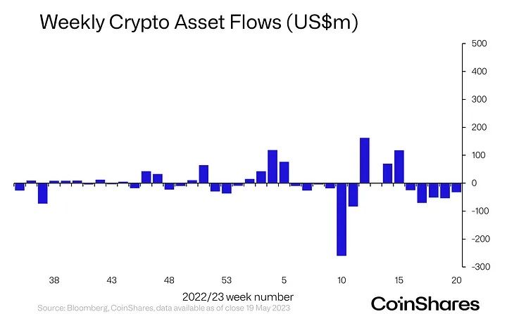 أظهر تقرير من منصة CoinShares أن أسواق العملات الرقمية المشفرة شهدت الأسبوع الخامس على التوالي من التدفقات النقدية السلبية من المنتجات الاستثمارية في الأصول الرقمية. حيث بلغت خسائر هذا الأسبوع 32.1 مليون دولار. و جمعت CoinShares البيانات من مزودي خدمات الاستثمار في الأصول الرقمية. مثل Grayscale و ProShares. الذين يخدمون المستثمرين المؤسسيين والمعتمدين.