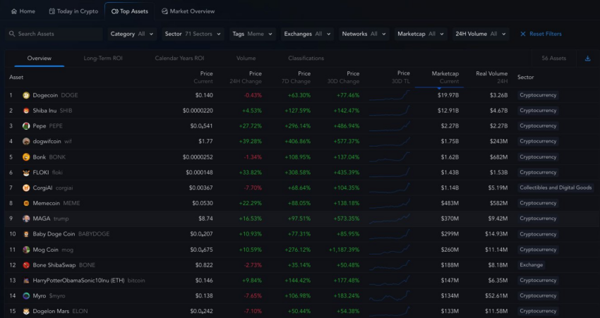 • تهيمن عملات Memecoins على السوق بقيمة سوقية إجمالية تزيد عن 40 مليار دولار، متجاوزةً بذلك قطاعات ناشئة مثل DeFi ومجموعات الصرافة.