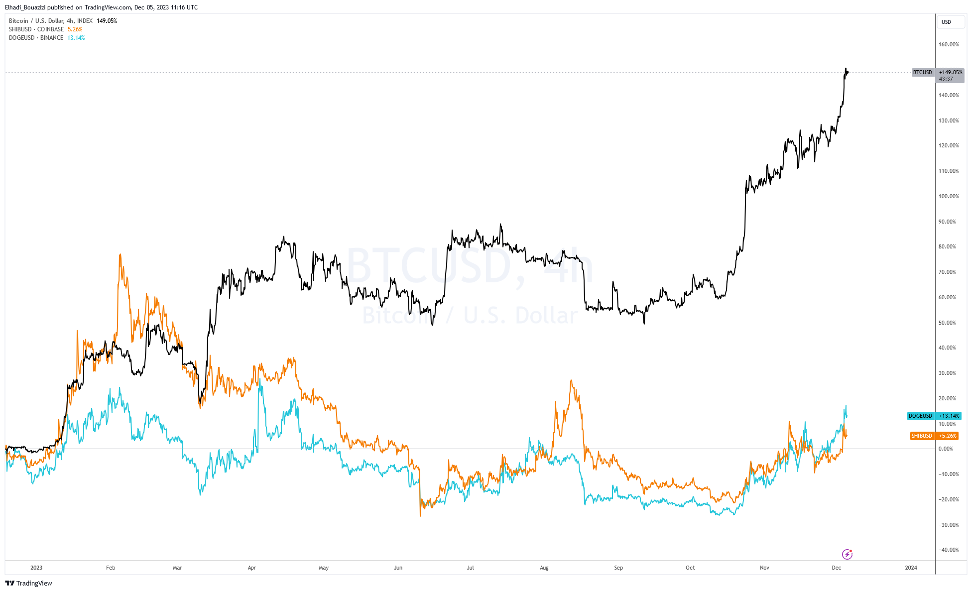 حيث سجلت دوجكوين DOGE ارتفاع بنسبة 25%، وشيبا اينو 9% منذ بداية العام الجاري. في حين أن عملة بيتكوين BTC مثلا سجّلت ارتفاع بنسبة 151%.