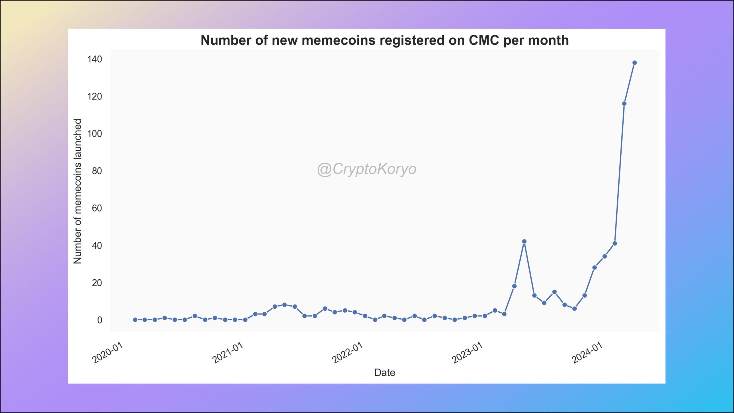 تشهد عملات الميم الرقمية المشفرة رواج لم يسبق له مثيل، حيث لم يتأثر نمو عددها و التداول عليها بالتعثر صعود عملة البيتكوين. فقد أحصى موقع CoinMarketCap عدد قياسي من عملات الميم الجديدة بلغ 138 خلال شهر أبريل/نيسان الماضي، مواصلًا بذلك اتجاهًا تصاعديًا ملحوظًا منذ أبريل/نيسان عام 2023، حيث بلغ تعدادُها 18 عملة جديدة فقط.