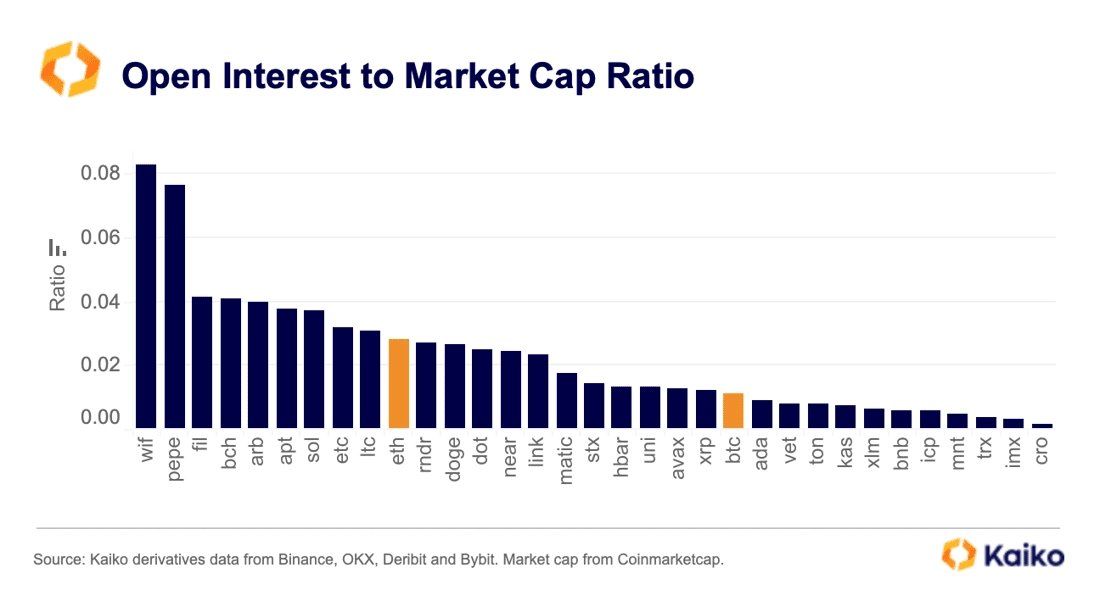 قالت شركة كايكو في نشرتها الأسبوعية أن:" عملتي (PEPE) و(WIF) تظهران ضعف النسبة مقارنة بالعملات البديلة الأخرى. فكلما ارتفعت هذه النسبة، دلّ ذلك على أن تحديد سعر العملتين يزداد تركيزًا على أسواق العقود الآجلة المستدامة."