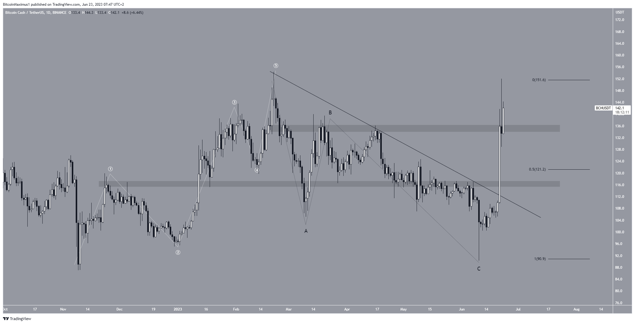 ارتفع سعر بيتكوين كاش منذ الانخفاض إلى 90.3 دولار في 10 يونيو. وكانت الزيادة متسارعة، مما أدى إلى إنشاء فتيل منخفض طويل في نفس اليوم، واختراق خط المقاومة التنازلي في 21 يونيو.