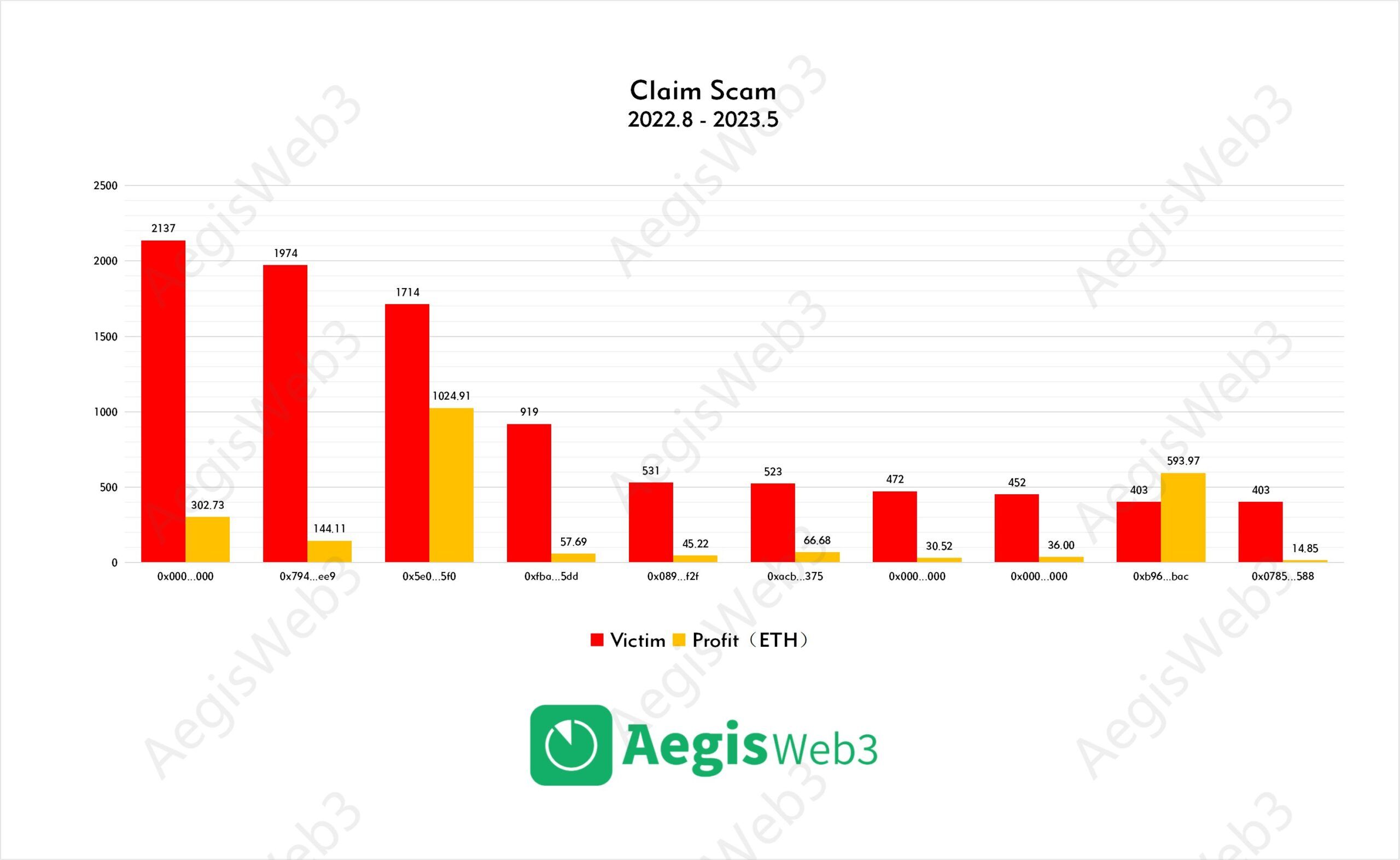 وحسب بيانات شركة AegisWeb3، تمكن أحد المحتالين من سرقة 1024 ETH من 1714 ضحية. بينما سرقت عصابة أخرى 302 إيثريوم من عدد كبير من الضحايا يملكون 2137 عنوان محفظة رقمية.
