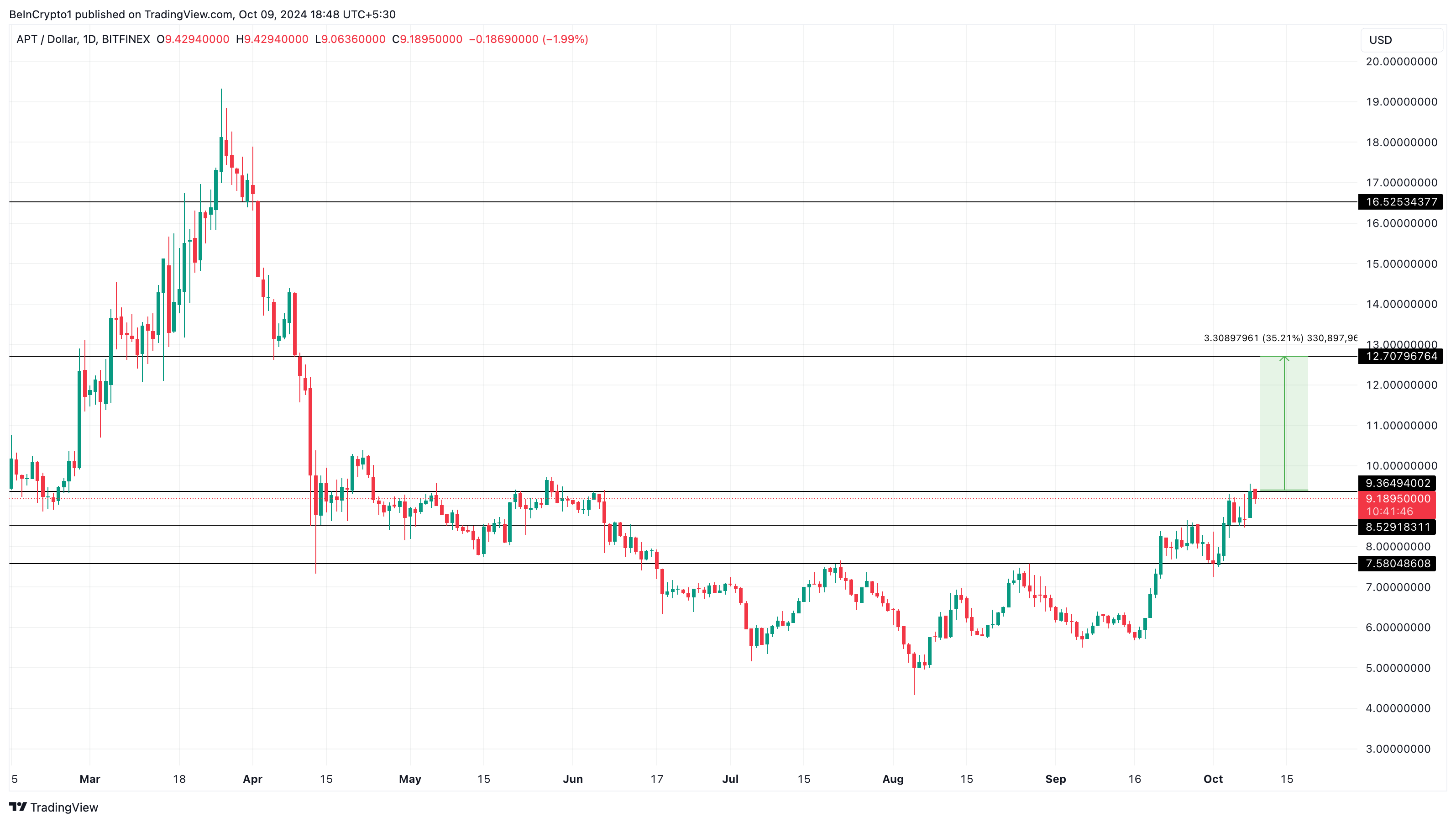 إذا حافظت الثيران على السيطرة، فقد يرتفع سعر APT بنسبة 35%، ليصل إلى 12.70 دولار. وفي ظل ظروف شديدة التفاؤل، قد يصل الرمز إلى 16.53 دولار، رغم أن ذلك يبدو غير مرجح قبل حدث فتح التوكنات يوم الجمعة.